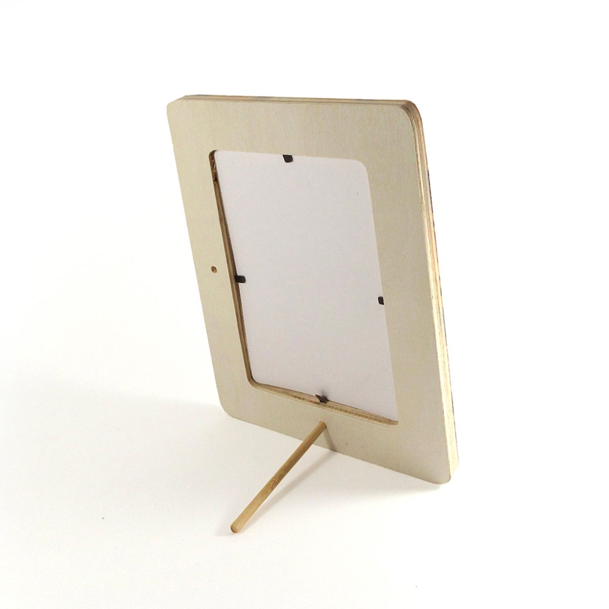 The frame measures 6.5 x 8.5" and fits a 4 x 6” photo. Made from Poplar plywood and features a satin finish, laminate coating for scratch resistant protection. Comes with a wooden dowel to stand the frame in portrait or landscape positions. DOES NOT include a protective photo cover.
